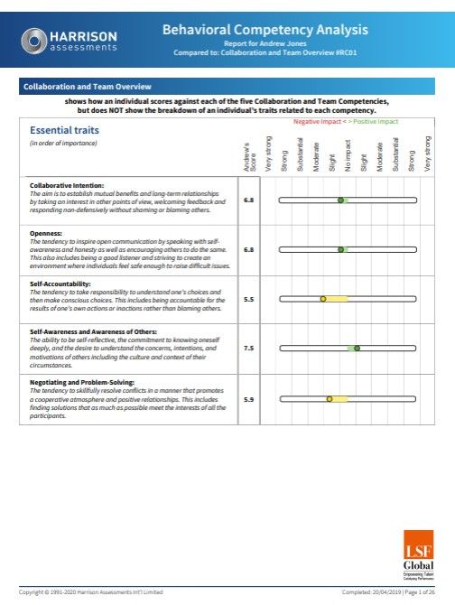 The Collaboration and Team Analysis helps individuals and organizations understand key behavioral competencies that influence teamwork, communication, and conflict resolution. It reveals strengths and development areas across five core dimensions essential for effective collaboration.