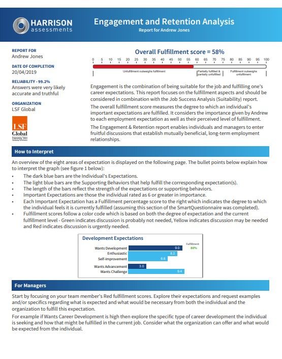 The Engagement & Retention Analysis uncovers what truly motivates individuals to stay engaged at work. By analyzing expectations across development, recognition, autonomy, and work-life balance, it reveals fulfillment gaps and provides actionable insights to improve retention and satisfaction.
