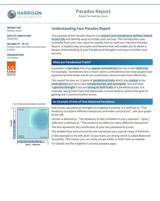 This report quantifies paradoxical traits that drive leadership and execution success. By measuring how individuals balance seemingly opposing behaviors—like being both assertive and empathetic—it reveals strengths, derailers, and development opportunities essential for personal and professional growth.