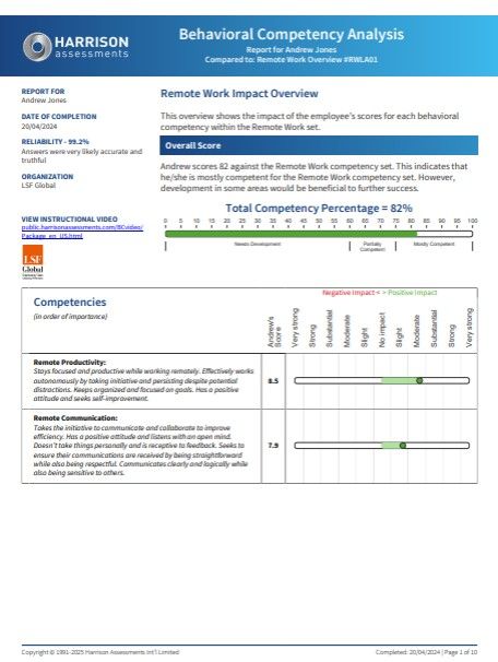 The Remote Work Competency Report evaluates an individual’s ability to perform effectively in remote or hybrid environments. It measures traits like autonomy, initiative, communication, and adaptability. With clear scores and behavioral insights, it helps individuals and teams enhance productivity, collaboration, and resilience in virtual work settings.