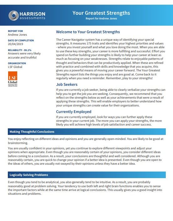 Your Greatest Strengths identifies your most enjoyable and productive behavioral traits, helping you understand what drives your success. It highlights strengths that support career development, personal growth, and workplace performance—empowering you to focus on what you do best.